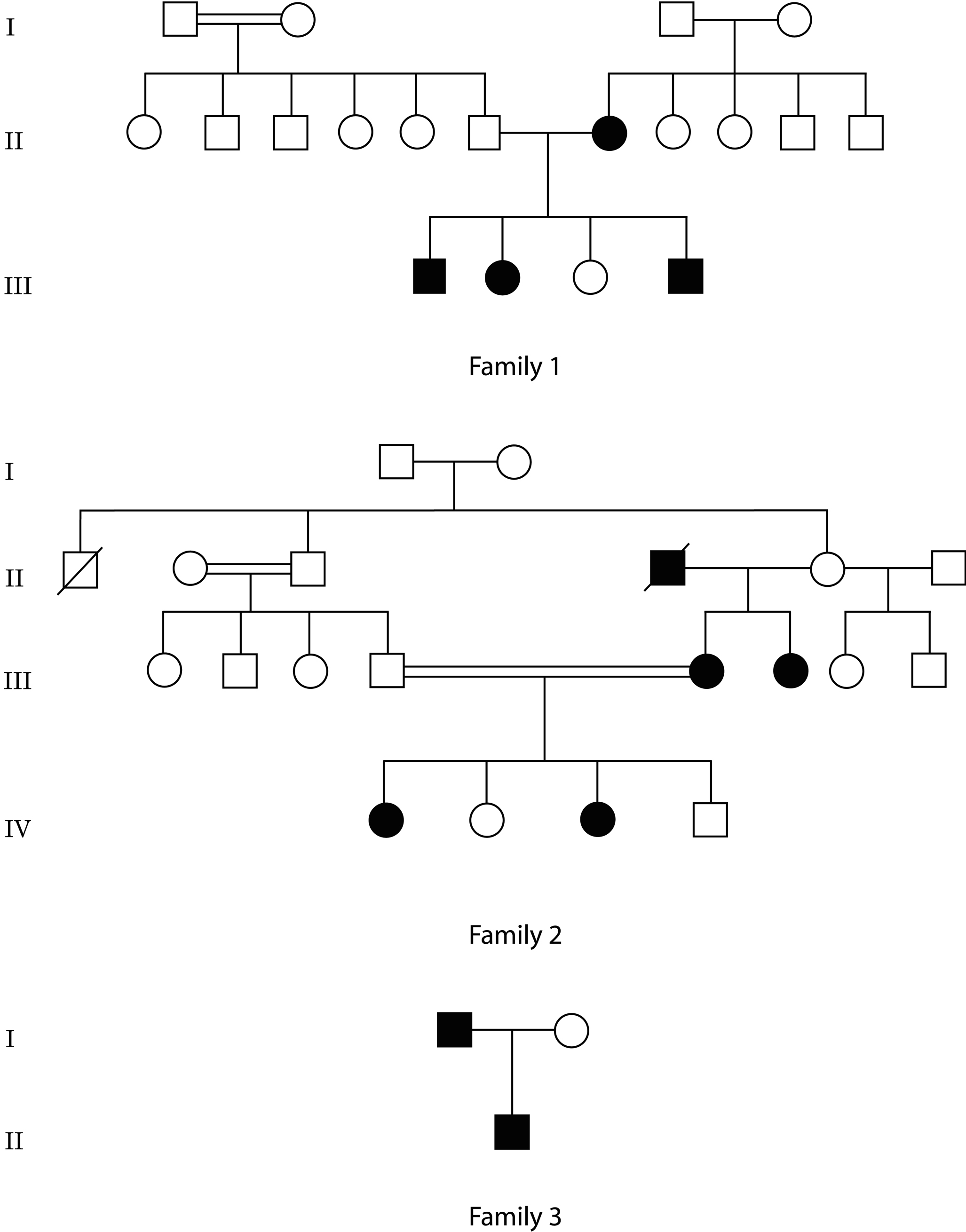 Pedigrees and mutation sequences of the three Egyptian families with autosomal dominant aniridia. Male and female subjects are represented by squares and circles, respectively, and affected family members have darkened symbols.