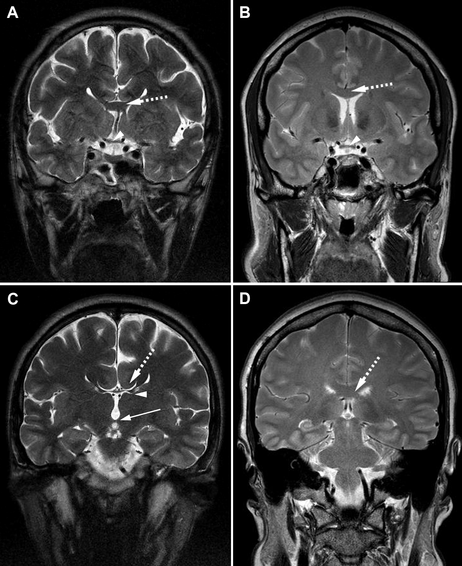 optic chiasm. B: Normal MRI images. Dashed arrow shows normal