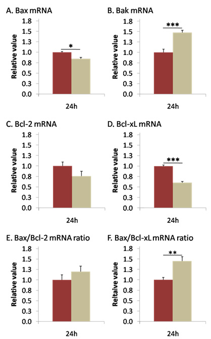 Bcl-xL mRNAs ratio 24 h after I/R. Brown columns denote control retinas (n=6), and beige columns denote ischemic retinas (n=10).