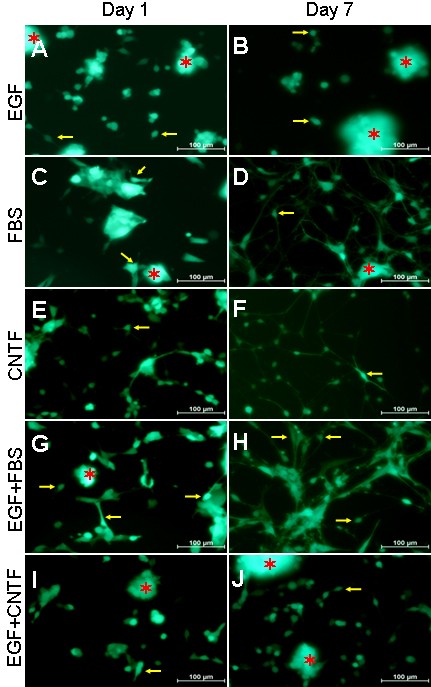large with polygonal morphology (C, G); with time, most cells exhibited two or more long processes which formed a network between cells by day 7 (D, H), and these processes were of finer caliber with FBS treatment (D) than was observed with EGF+FBS (H). E, F: After CNTF treatment, most cells exhibited short processes on day 1 (E) and formed long neurite-like processes by day 7 (F). I, J: In EGF+CNTF treatment, some cells had short processes from day 1 to day 7, whereas long processes were not observed.