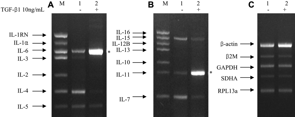Figure 2. Multiplex reverse transcription PCR. Multiplex reverse transcription PCR sets for interleukins (ILs; A, B) and housekeeping genes (C). For each set of data, lane 1 represents the control group with no transforming growth factor (TGF)-β1 treatment and lane