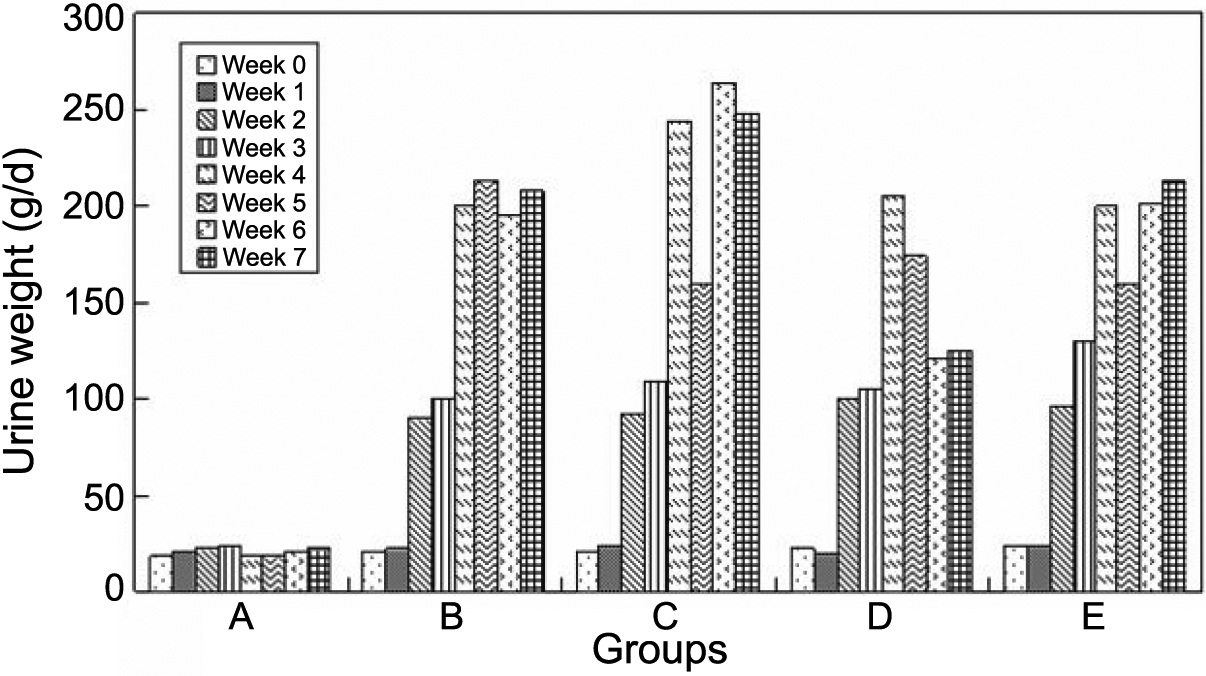 Figure 3. The effect of carnosine, aspirin, and a combination of both eye drops on urine weight of each rat per day in various groups,
