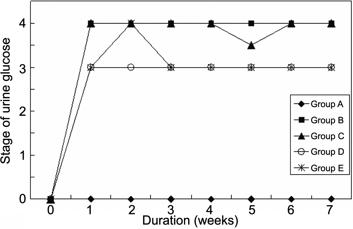 Figure 4. The effect of carnosine, aspirin, and a combination of both eye drops on stage of urine glucose of each rat per day in various