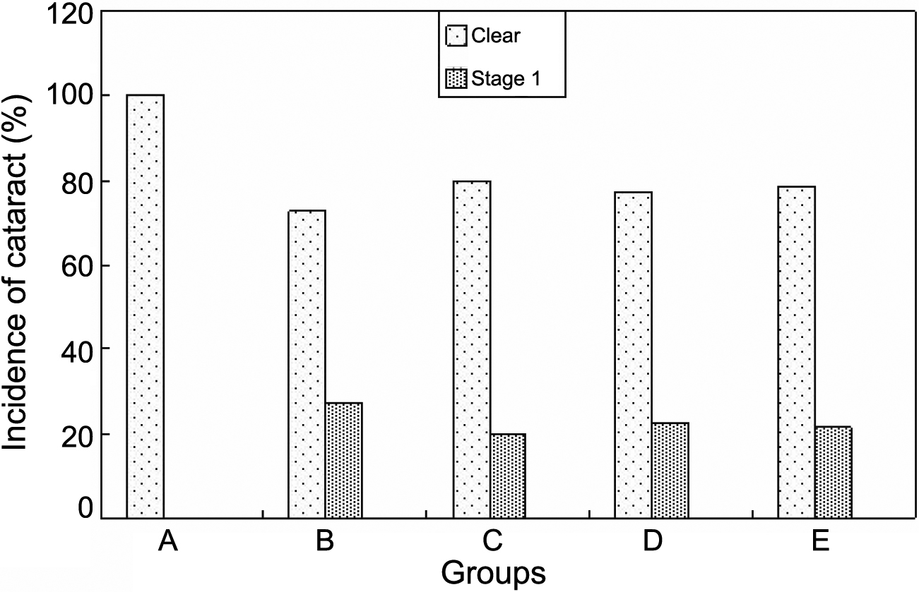 calculation of the incidence of lenses in various stages, total lenses in a group were considered to be 100%. Panel A was the normal control group, panel B was the diabetic rats untreated group, panel C was the diabetic rats treated with carnosine eye drops (1% only) group, panel D was the diabetic rats treated with aspirin eye drops (0.05% only) group, and panel E was the diabetic rats treated alternately with carnosine (1%) and aspirin (0.05%) eye drops group. These data suggested that