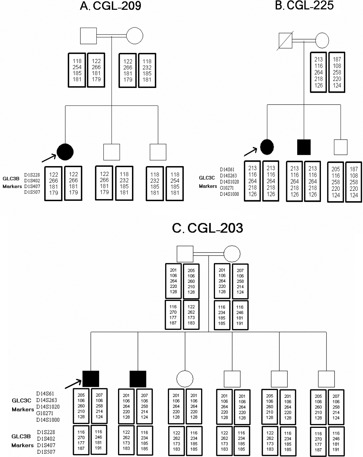 individuals are shown. A: Linkage to GLC3B was not rejected in family CGL-209. B: Linkage to GLC3C was not rejected in family CGL-225. C: Family CGL-203 does not show linkage to GCL3B or to CGL3C.