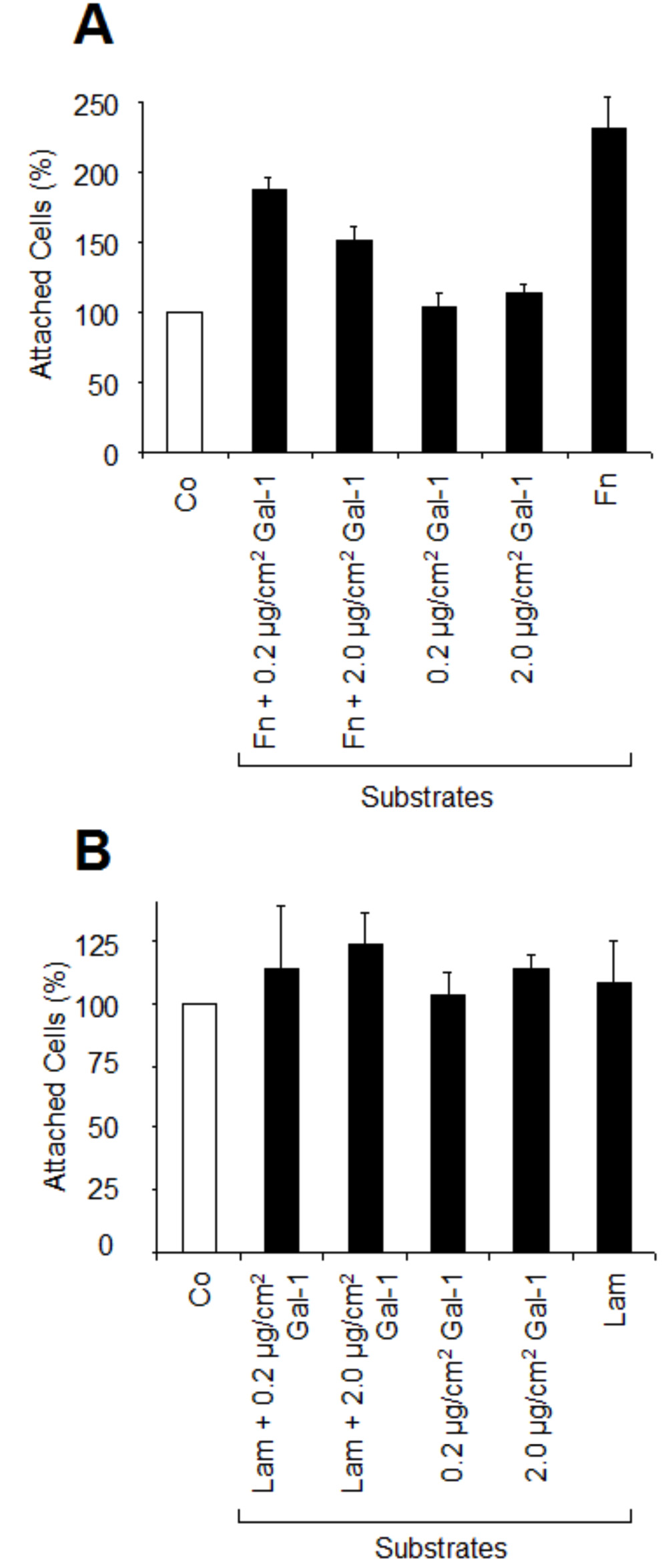 or Fn+ Gal-1 (A), or Lam, or Lam+Gal-1 (B), or Gal-1 alone (A, B; see Methods section). Controls (Co) were plated on protein-free plastic. Values represent means±SD of three experiments
