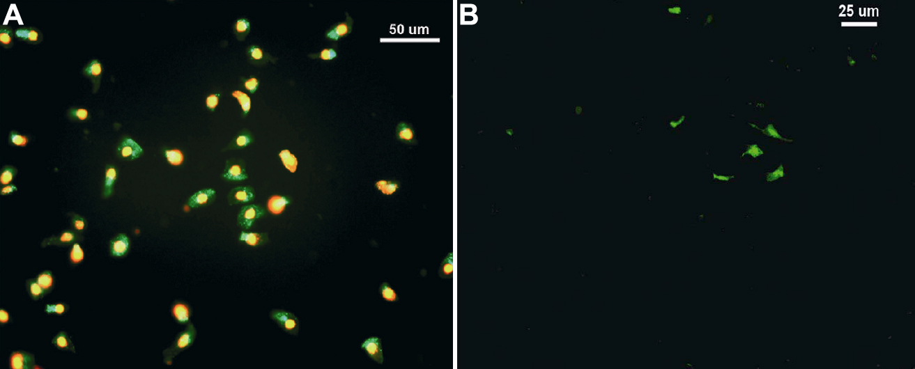 medium (FBSm10), the calcein dye was retained within living cells (green) while EthD-III was bound to nucleic acids of cells