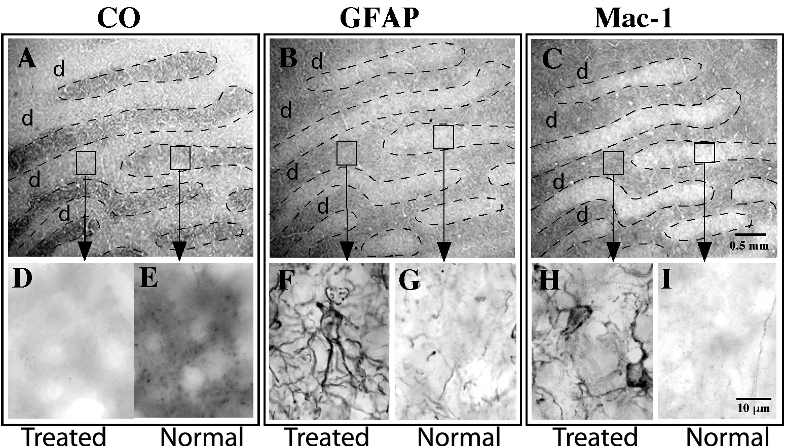 E), GFAP (F, G), or MAC-1 (H, I) immunoreactivity.