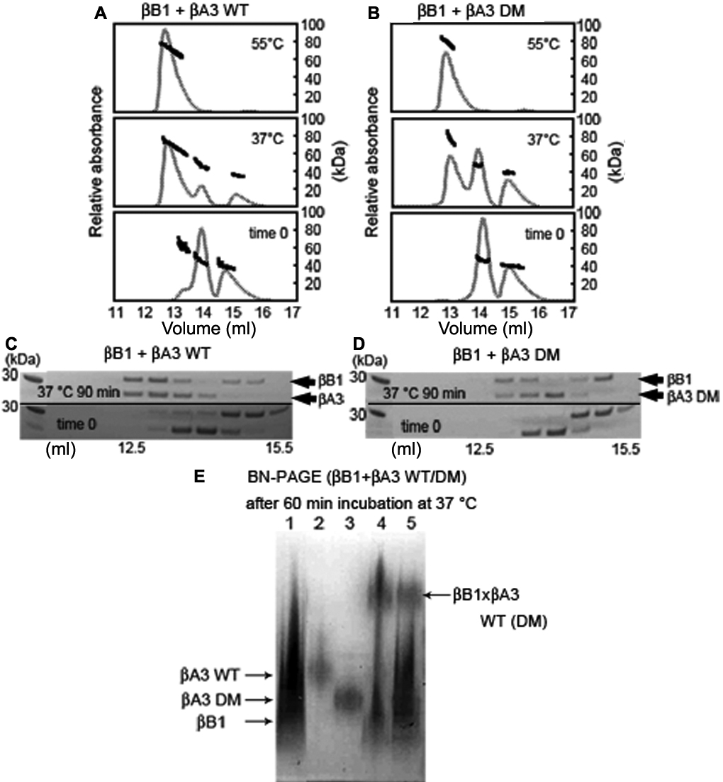 E). Proteins were βB1 (lane 1), βA3 WT (lane 2), βA3 DM (lane 3), βB1:βA3 WT (lane 4), and βB1:βA3 DM (lane 5).