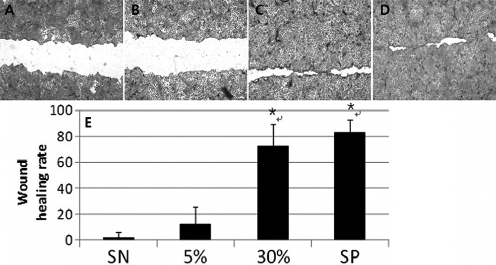 A–D: Wounds in the negative control, amniotic membrane (AM) suspensions of 5% and 30%, and the positive control (SP) healed after