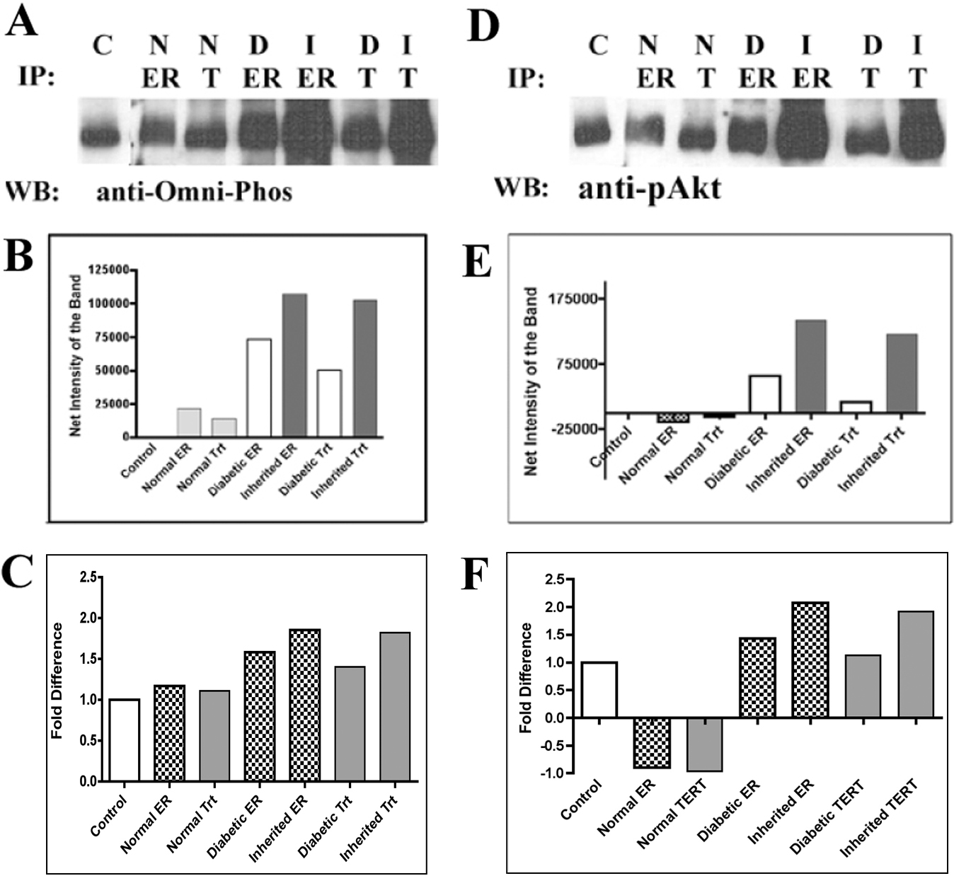 antibody or anti-pAkt antibody. A-C: Anti-Omni-phos® antibody detected nonspecific phosphorylation of ERα and TERT in both normal and cataractous LEC, though