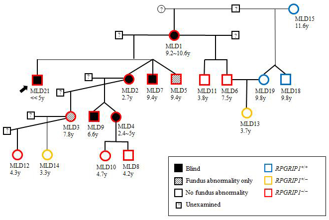fundus with no apparent visual dysfunction; white, no fundoscopic abnormality with no apparent visual dysfunction. RPGRIP1 genotypes are denoted as follows: wildtype homozygote, in blue (+/+); heterozygote, in yellow (+/−); insertion homozygote,