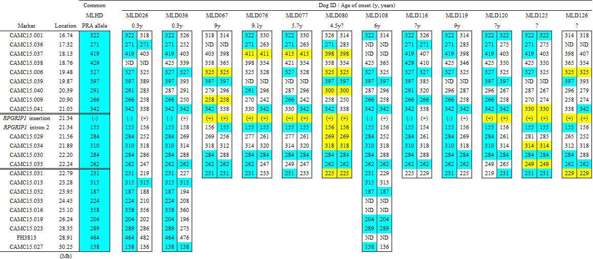 (-) and (+) for the marker RPGRIP1 insertion each represents the RPGRIP1 insertion allele and the wildtype allele, respectively. ND indicates that the genotype was not determined.
