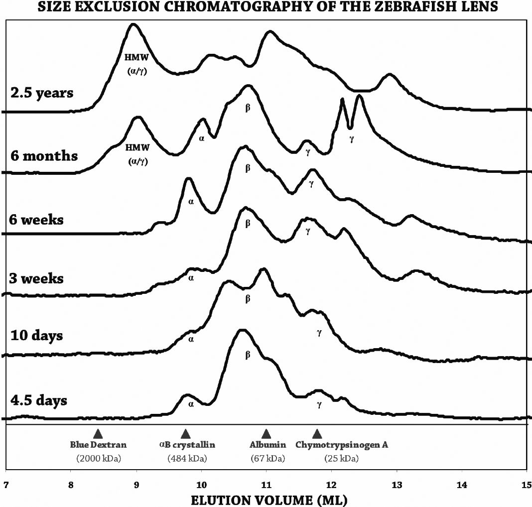 Figure 1. Size exclusion chromatography of zebrafish lens homogenates during development and aging. Absorbance at 280 nm for detection