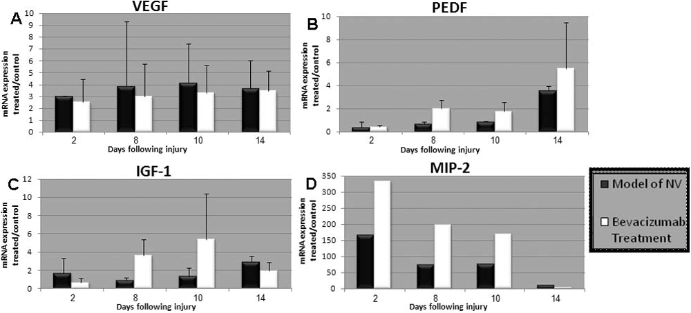 Figure 6. Molecular analysis of gene expression levels after chemical cauterization in the untreated and bevacizumab treated mice. VEGF expression up-regulated in all time points, with a slight decrease following bevacizumab treatment (A). PEDF showed an inverse pattern of expression to VEGF (B). IGF-1 expression increased between days 8 and 10 following injury, with a higher level in the bevacizumab treated group (C). MIP-2 expression significantly increased in both the untreated and treated mice on day 2 and then dropped to near-normal levels