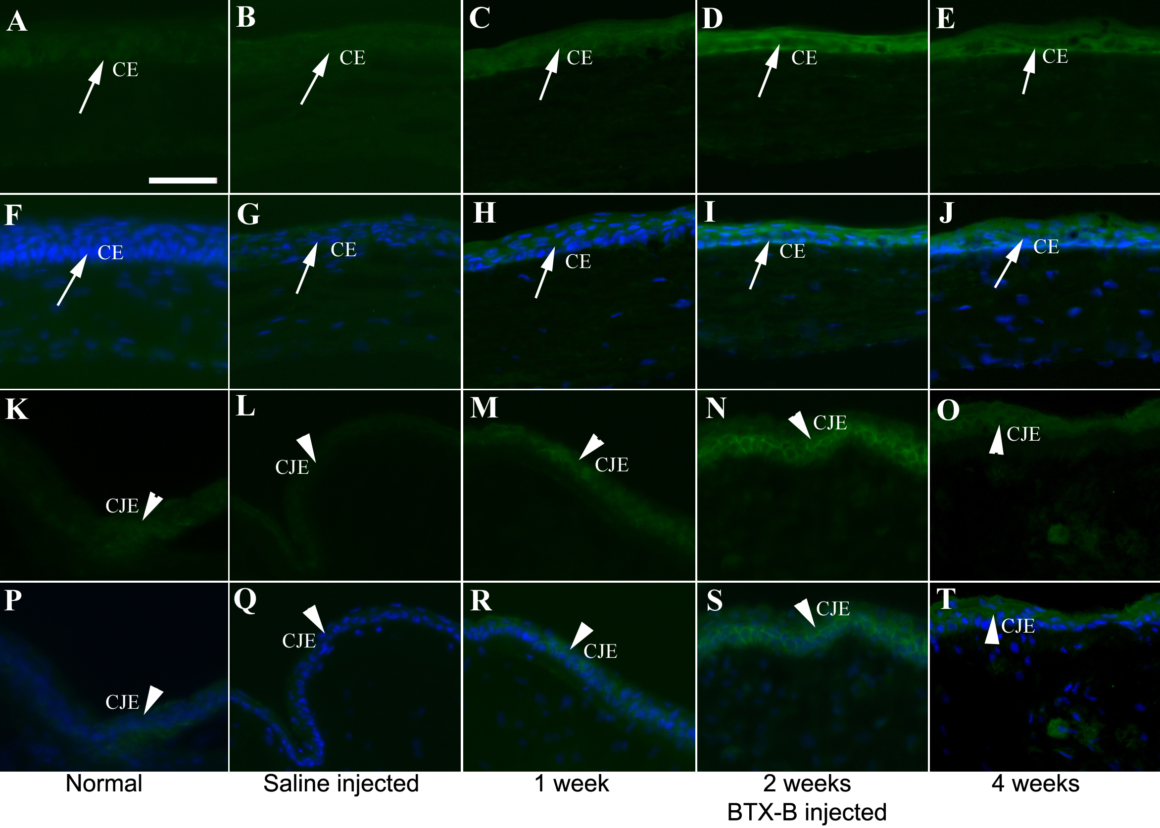 CJE was strong in BTX-B injected mice. Nuclear staining (blue). (F-J)