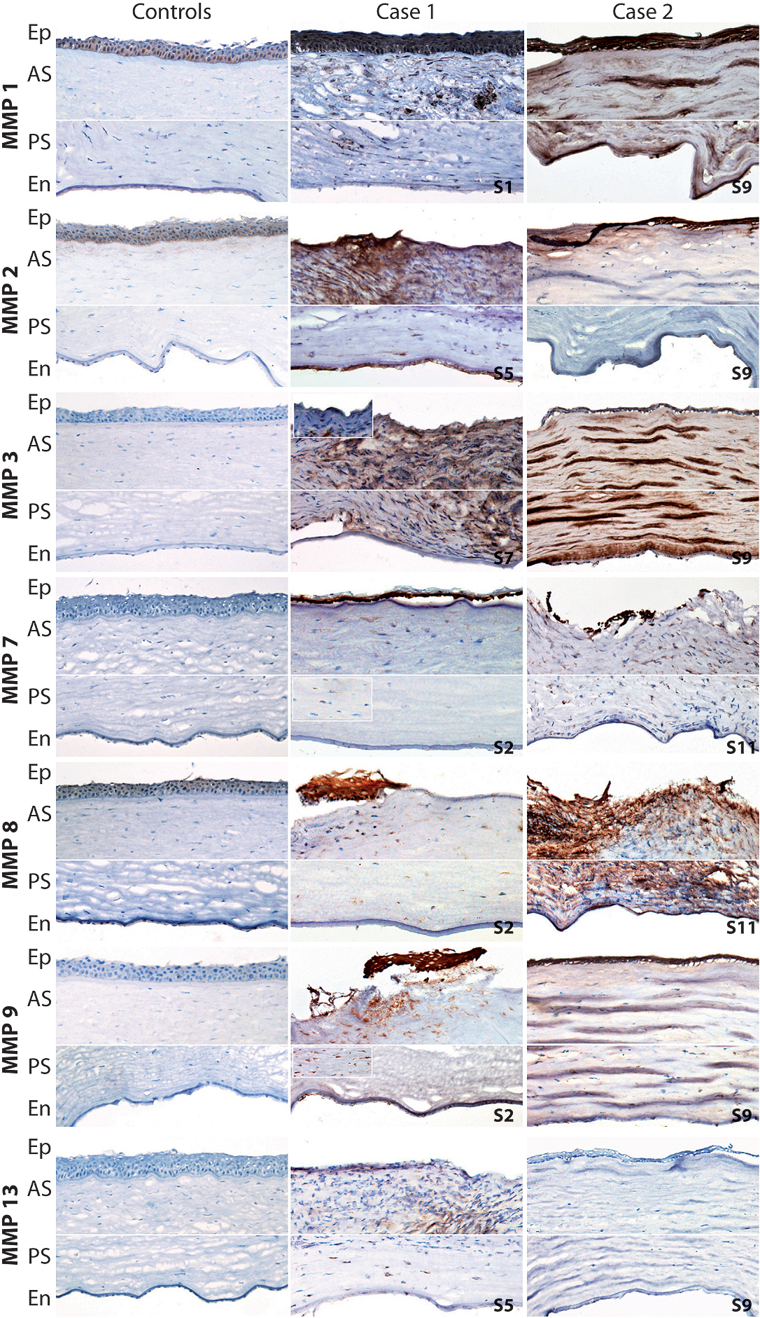 Immunohistochemical localization of MMP 1, 2, 3, 7, 8, 9, and 13 in
