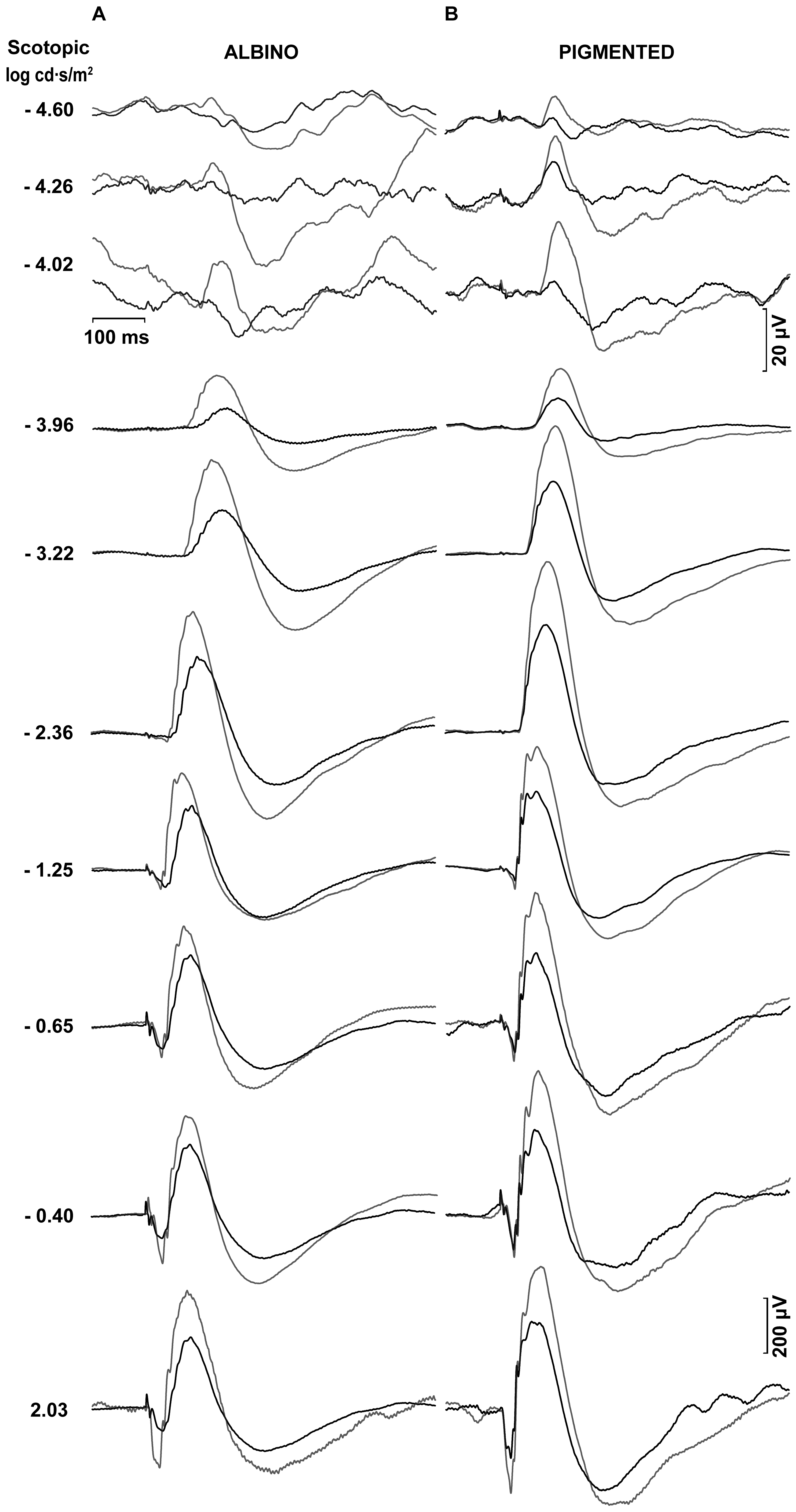 traces recorded in an albino (A) and pigmented (B) rat in