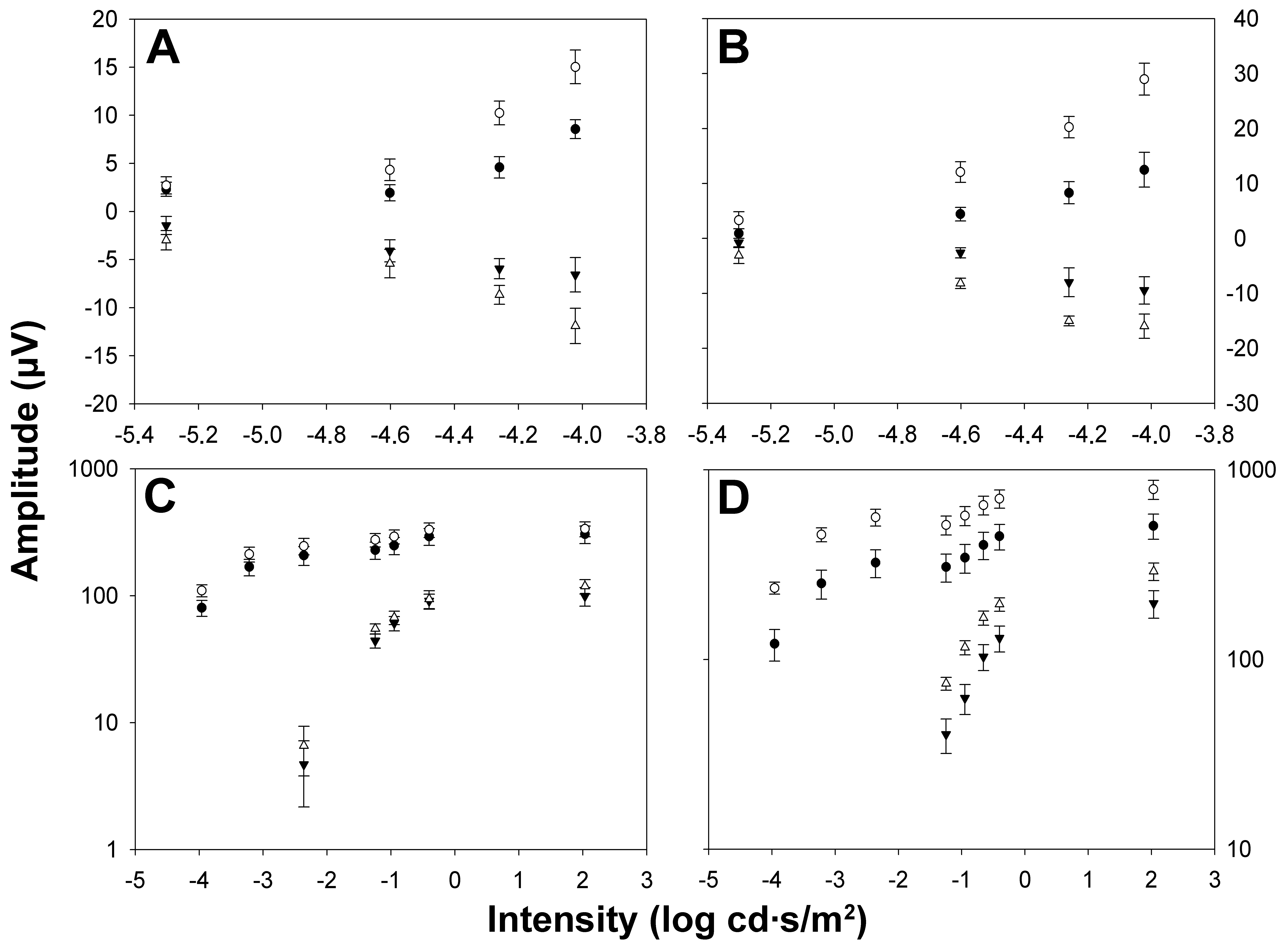 (mean±SEM) of ERG amplitudes versus stimulus intensity both from albino