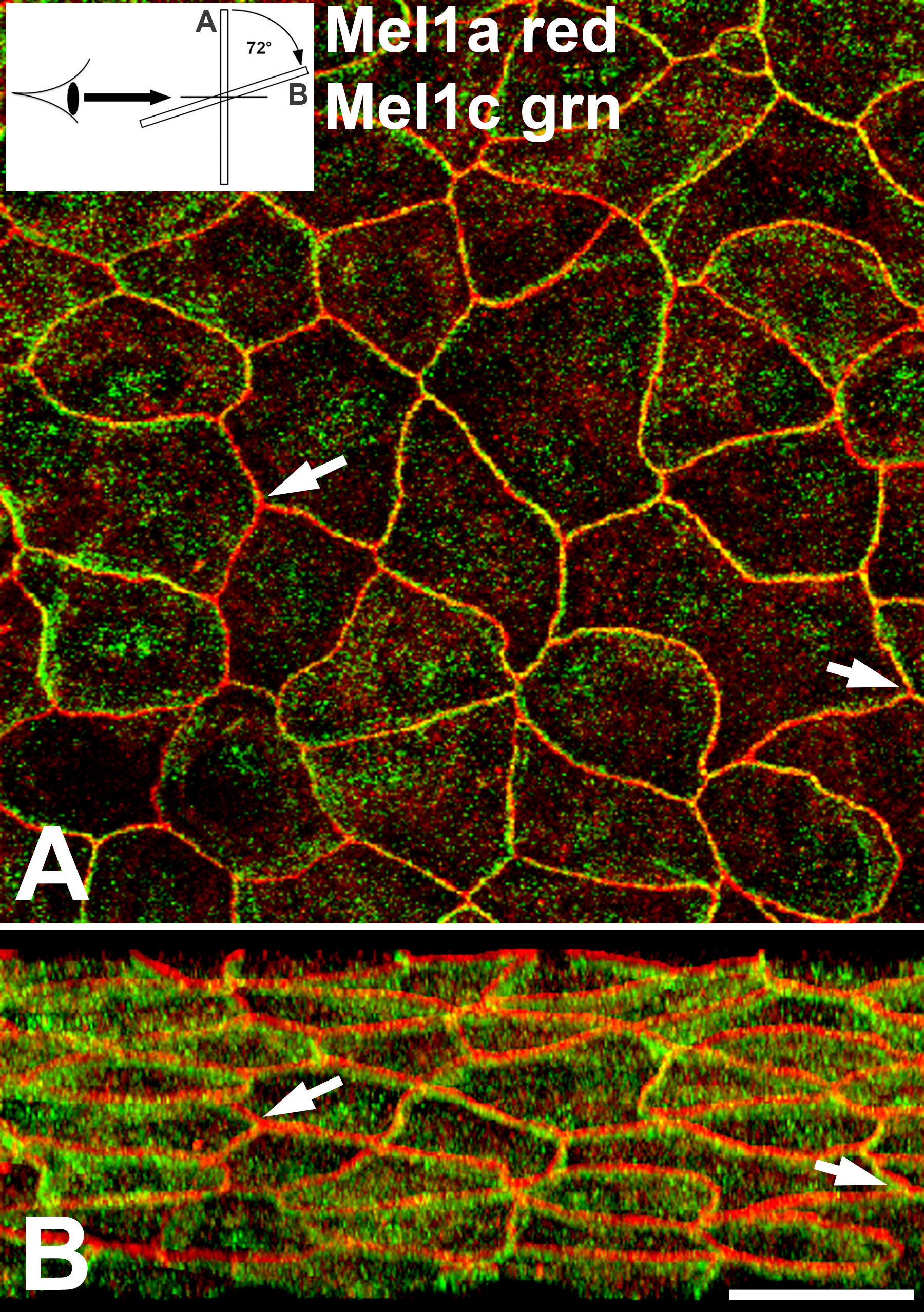 immunolabeling. The rotated image shows that the red Mel1a labeling is