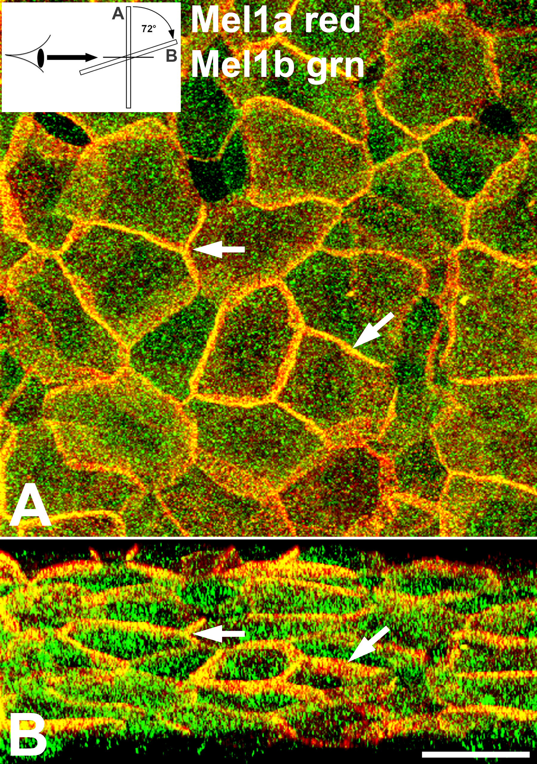 immunolabeling. The rotated image shows that the Mel1a-Mel1b-labeled