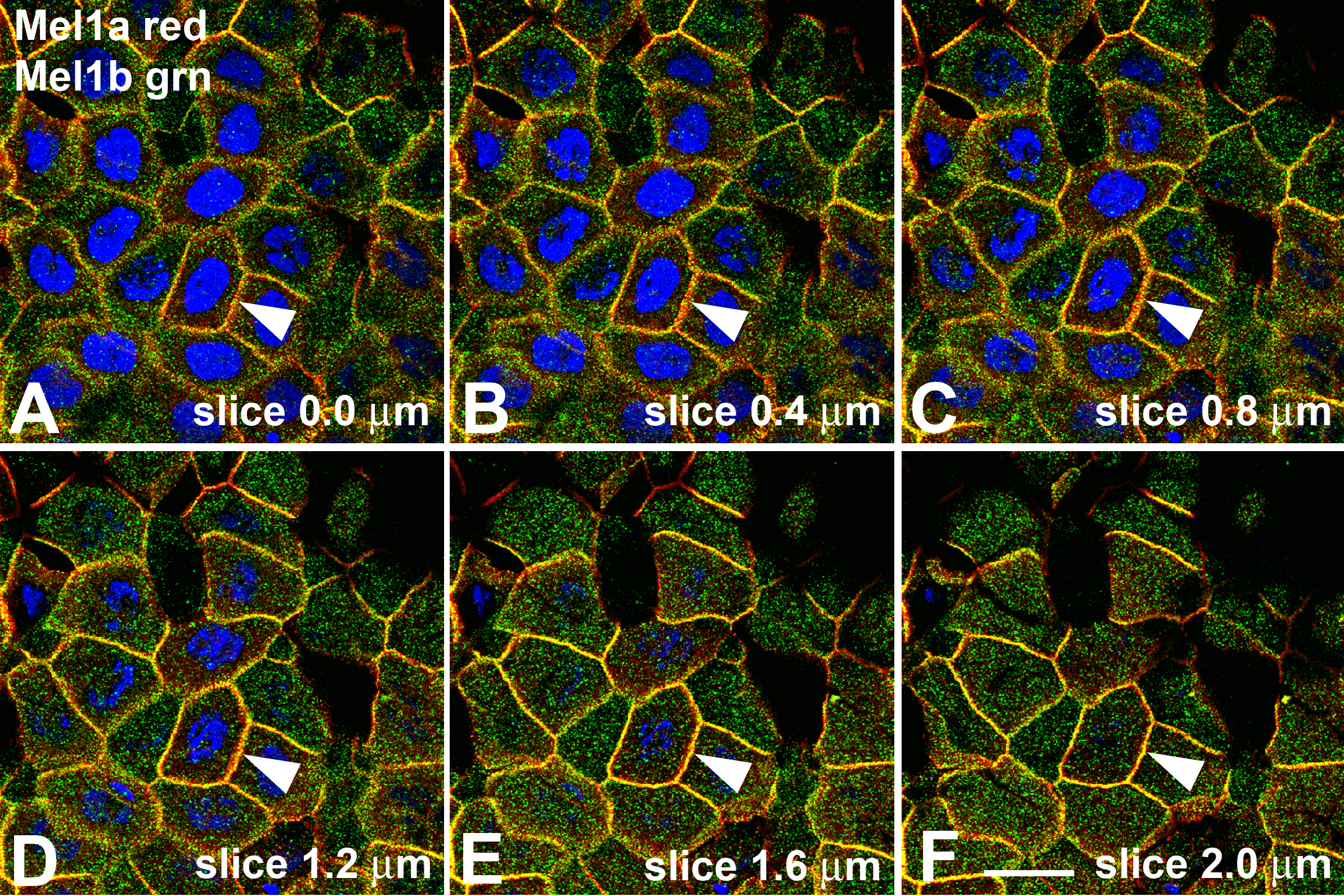 interdigitated red Mel1a labeling (note arrowheads indicating an