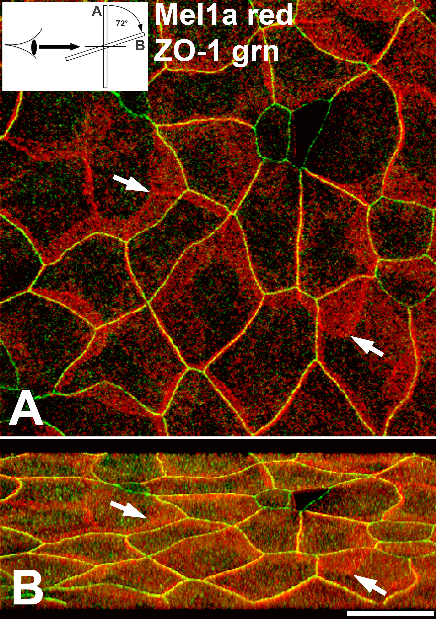 apically to the red Mel1a labeling. The ZO-1 labeling appears as a
