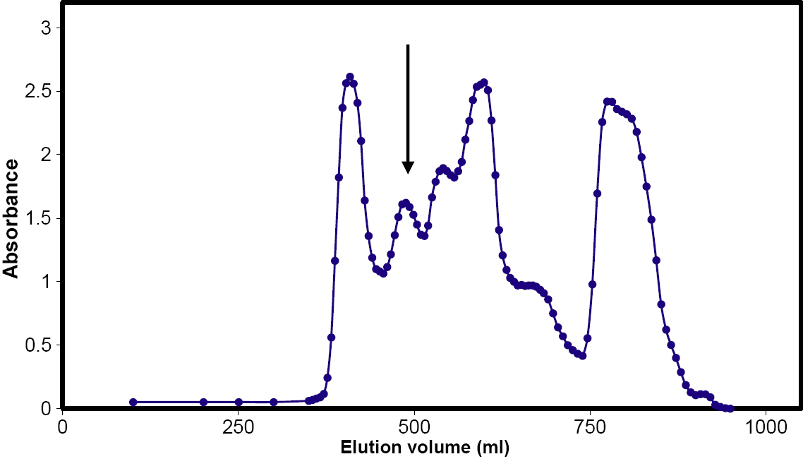 Fractionation of dogfish lens extract on a 3×150 cm Sephacryl S300 column. The position of the α-crystallin peak (490 ml) is indicated with an arrow. The central 50% of the peak was rechromatographed under the same conditions.