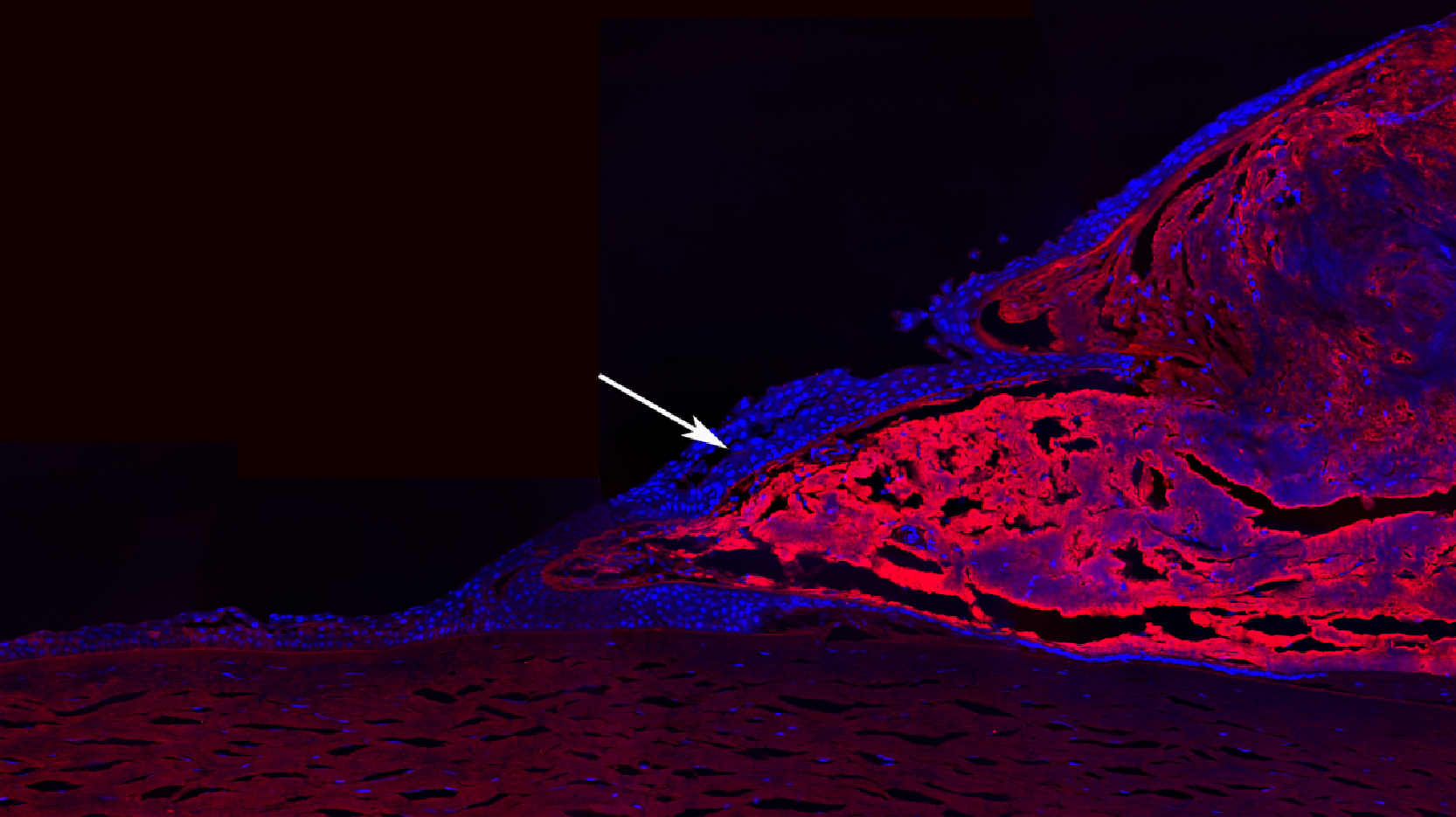The abundance of clusterin in pterygium is illustrated by immunofluorecence. Labeling for clusterin is in red, nuclei are blue (DAPI). The arrow indicates cells enveloping the body of the pterygium that are clusterin negative.