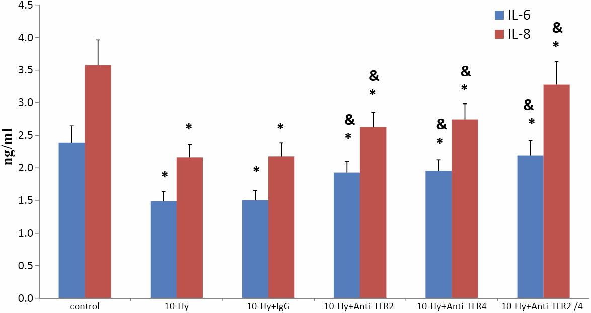 Figure 5. The results of ELISA showed the release of IL-6 and IL-8 from HCFs under different stimulation. Data are the mean±SEM of triplicates