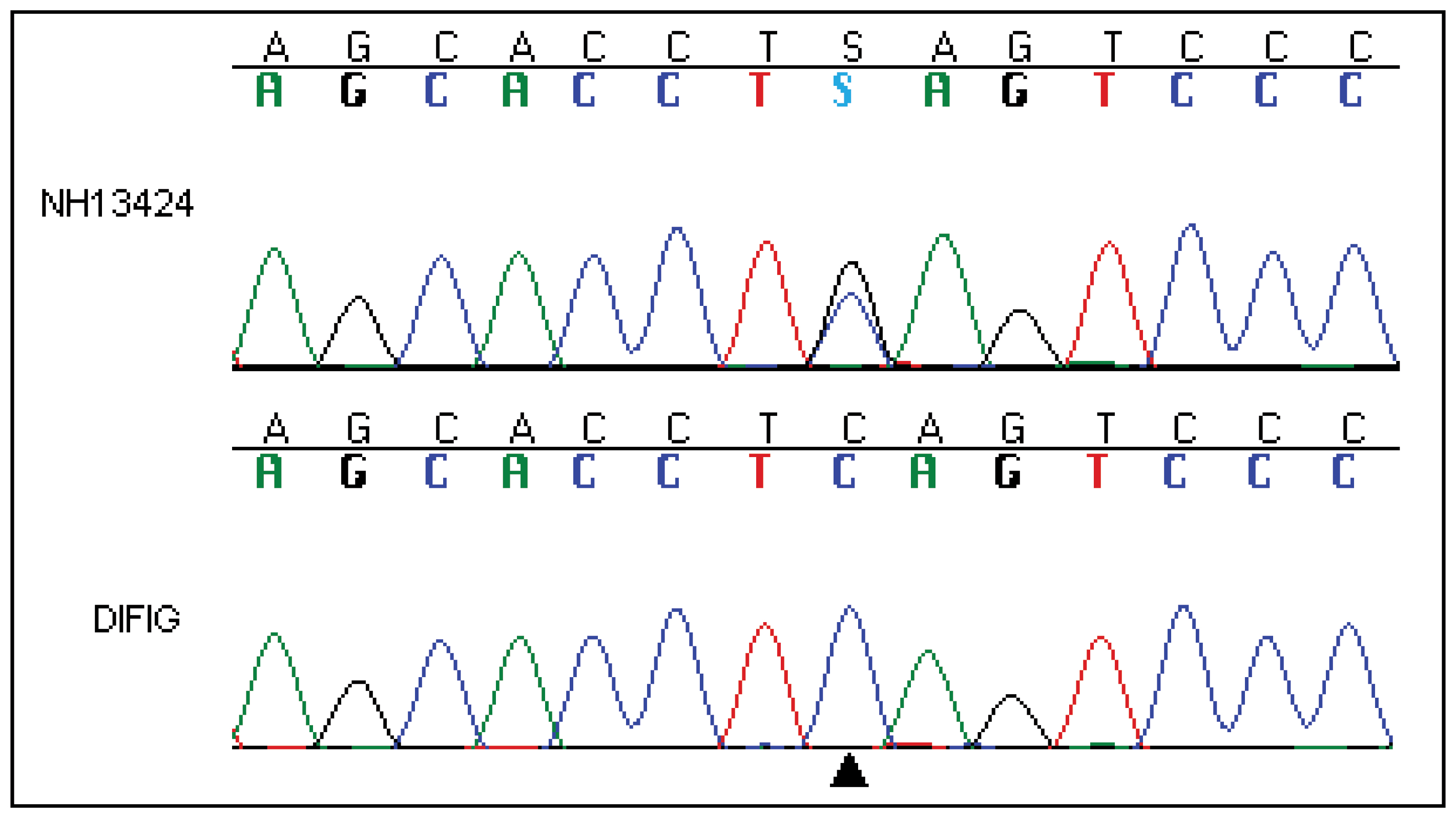 Direct sequencing. At the position indicated by the black arrowhead, the heterozygous C>G change is revealed in the DNA sequence trace for patient NH13424. Below this the wild type trace for normal control subject DIFIG is shown.
