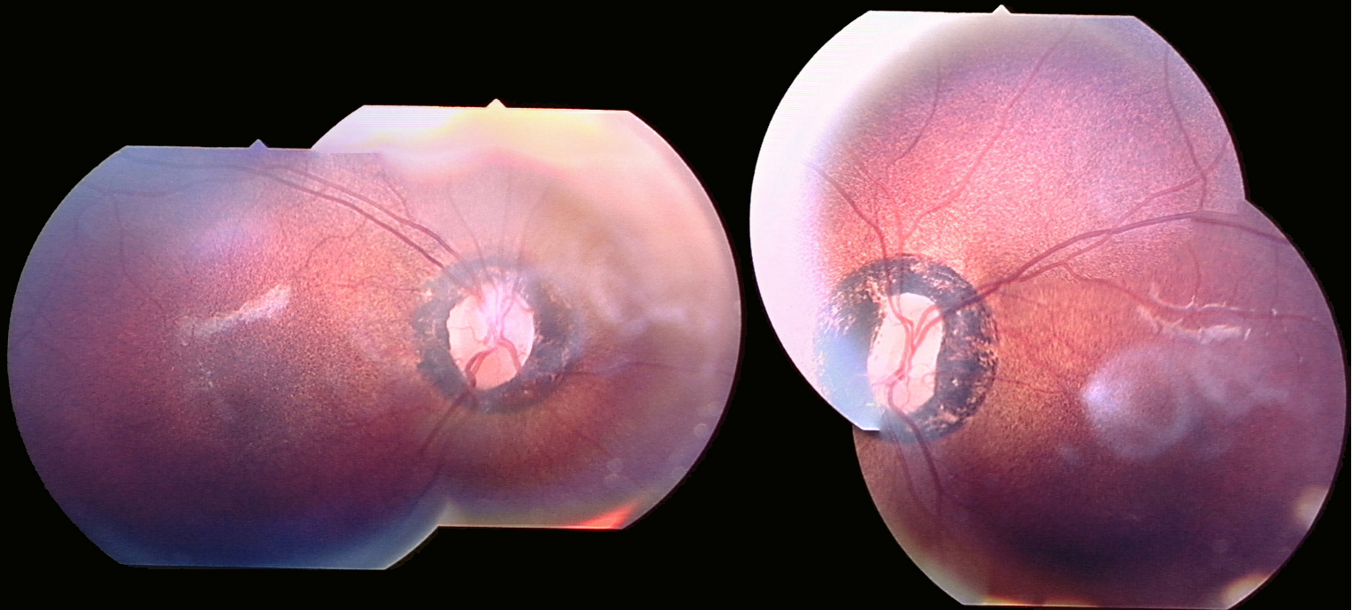 Figure 2. Fundus photography. Images are right and left eye color fundus photograph composites of patient NH13424 performed using TOPCON