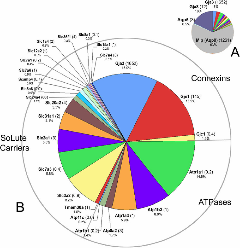 Figure 2. Transport proteins detected in the lens membrane proteome. A: Mip, a lens-specific aquaporin protein, and Gja8, a connexin protein, together dominate this category of proteins. B: To better visualize the results, Mip and Gja8 have been removed from the data set. Three classes of membrane transport protein