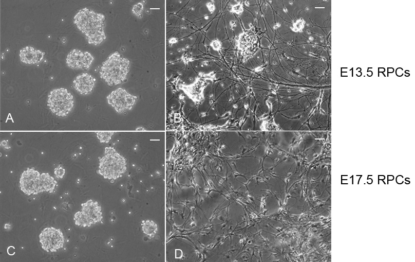 neurospheres in proliferation culture (A, C). After starting the differentiation culture, E13.5 and E17.5 RPCs became adherent growth and initiated differentiation by