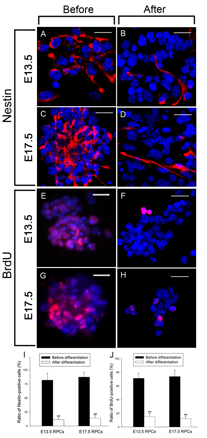 was vigorous, but significantly decreased after 8 days of differentiation (A–D, I). Similarly, the incorporation ratio of BrdU in both RPCs decreased dramatically after differentiation (E–H, J). Bars were 20 μm. Data in I and J is mean±standard deviation (n=3). The significance was determined by the Student t-test. The symbol ** represents p<0.01 versus before differentiation.