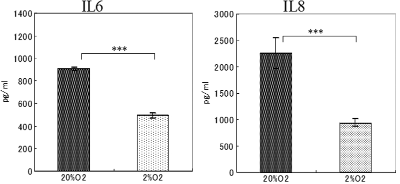 Figure 4. Cytokine secretion by SV40-HCEs cultured under 20% O2 (control group) or 2% O2 (hypoxia group) stimulated with LPS. The culture medium was collected 24 h after LPS exposure and analyzed for the presence