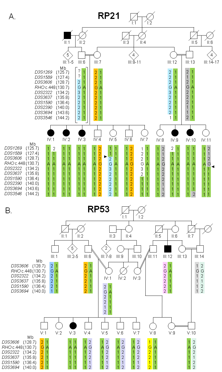 Figure 1. Pedigrees and 3q21 marker haplotypes spanning the RHO gene in autosomal recessive retinitis pigmentosa families RP21 (A) and RP53 (B). A: Family RP21 consists of four generations. White circles represent unaffected females, filled circles affected females, white