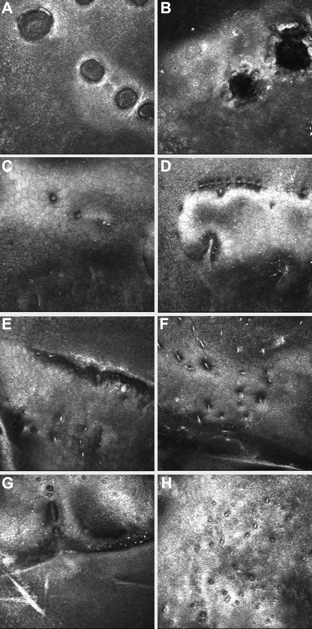 Figure 3. IVCM images of phenotypes of PPCD. Vesicular type: A, B (Patient #5) and C, D (Patient #1) - vesicular type. A is at the level of DM, showing a row of focal elliptical vesicular lesions, each has a hyper-reflective halo. B is at the level of the endothelium. Vesicular lesions have hypo-reflective centers and scalloped borders. C: multiple small focal vesicular endothelial lesions. Band Type E, F (Patient #7) and G, H (Patient #4). E shows the edge of a band lesion. It demonstrates the undulation of DM and endothelial surface. F: this image from within a band demonstrates abnormal dimpling of endothelial cells. G shows the edge of a band lesion. It demonstrates the undulation of DM and endothelial surface and hyper-reflective DM. H: within the band lesion. Abnormal dimpling of endothelial cells with hyper-reflectivity of the overlying Descemet's membrane.