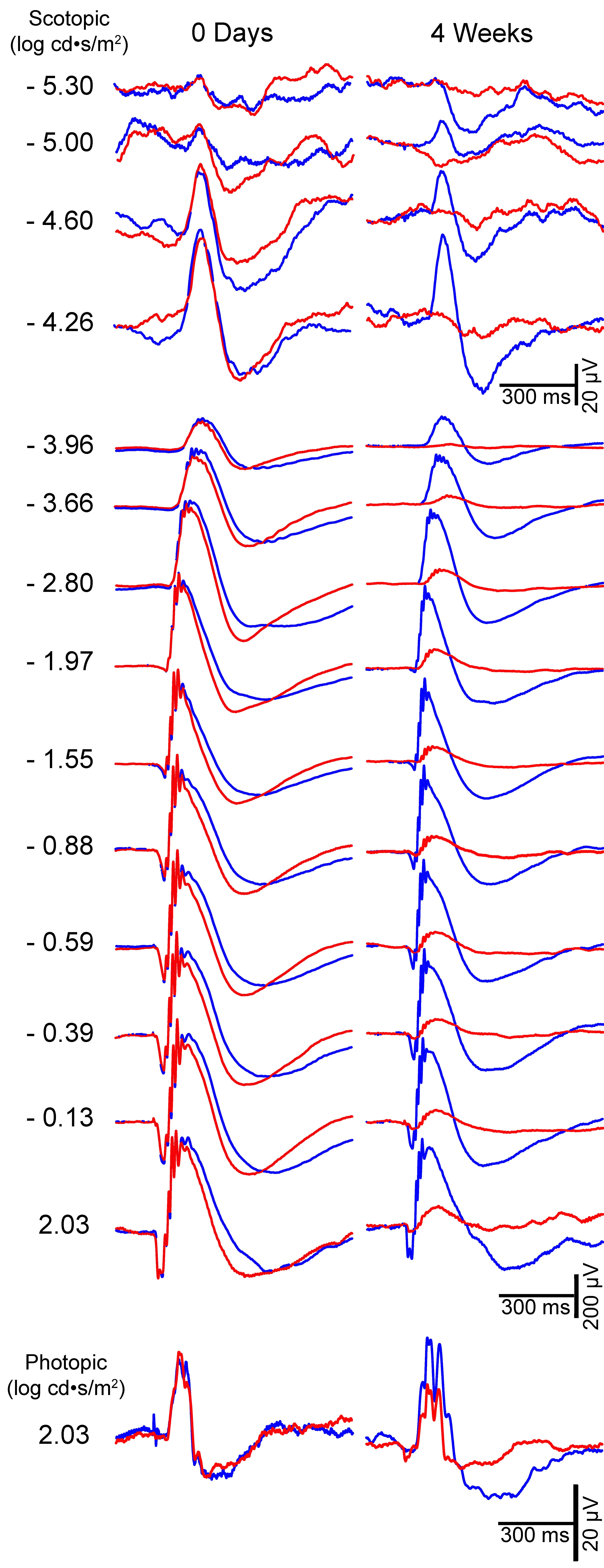 flash stimuli of increasing intensity for the untreated right eye (blue