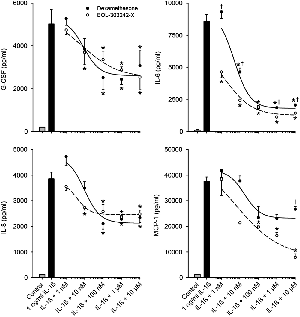 a p≤0.05 versus that for IL-1ß. The dagger indicates a p≤0.05 versus BOL-303242-X at same concentration. Statistical analysis