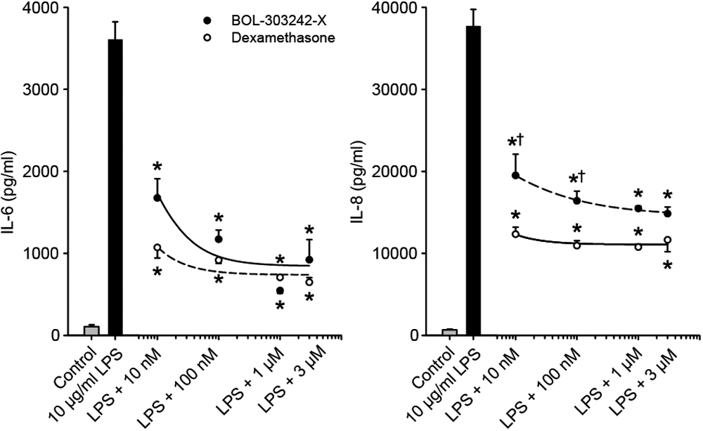 media was determined by Luminex. Data are means±SEM; n=3. The asterisk indicates a p≤0.05 versus LPS. The dagger indicates