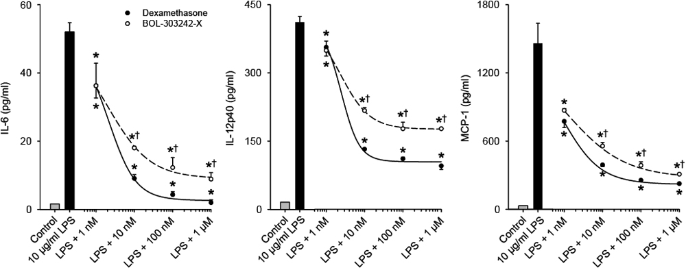 Figure 5. BOL-303242-X reduces LPS-induced cytokine release with similar activity as dexamethasone (DEX) from THP-1 cells. Cells were