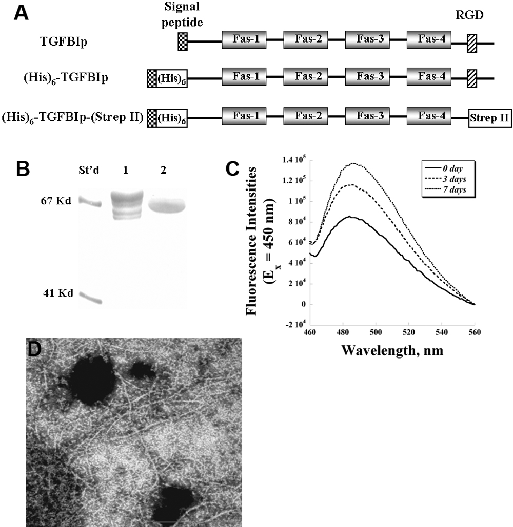 II tag; "Fas": Fasciclin-like domain; "RGD": arginine-glycine-aspartate motif. B: Purified recombinant TGFBIp were analyzed on a 12% SDS-PAGE gel. “St’d”: molecular markers; lane 1: single-tagged (His)6-TGFBIp; lane 2: double-tagged (His)6-TGFBIp-(Strep II) protein. The amyloid fibril formation of recombinant TGFBIp was obtained after incubation in 1× Tris-buffered
