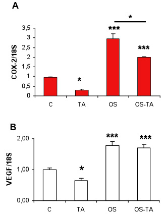 Figure 11. COX-2 and VEGF mRNA expression in RPE cells treated with TA. COX-2 (A) and VEGF (B) mRNA expression (real time quantitative PCR) in untreated control primary rat RPE cells (C), or in RPE cells exposed to triamcinolone acetonide (TA), outer segments (OS) or both (OS-TA). Results are expressed as