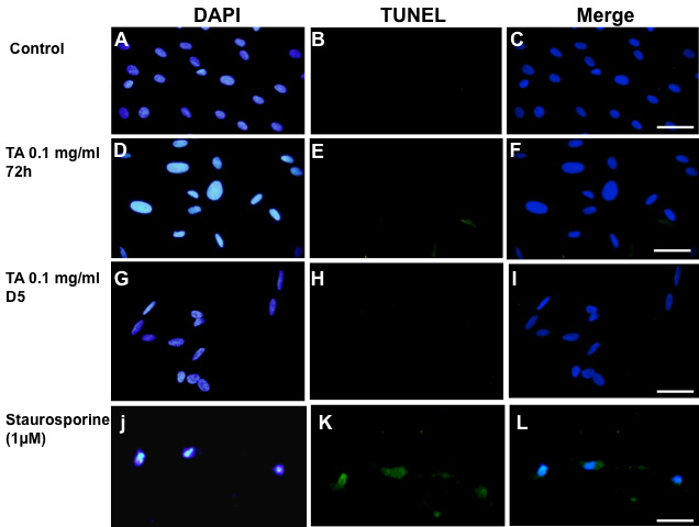 vehicle,1% ethanol, (A-C). No TUNEL-positive cells could be observed after exposure to 0.1 mg/ml TA for 72 h (D-F) or five days (D5, G-I). As a positive control for the TUNEL technique, BRECs were treated with 1 μM staurosporine (J-L). Nuclei were stained with DAPI (A, D, G, J). Scale bar represents 60 µm.