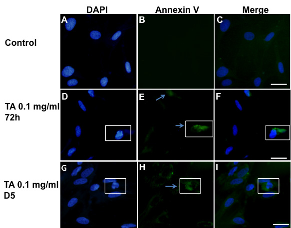 A-C) or with 0.1% TA for 72 h (D-F) or five days (G-I). Condensed nuclei are seen in TA treated cells (D and G, squares) as well as Annexin-V positive cells (E and H, squares). Arrows indicates Annexin-V positive cells. Scale bar represents 50 µm.