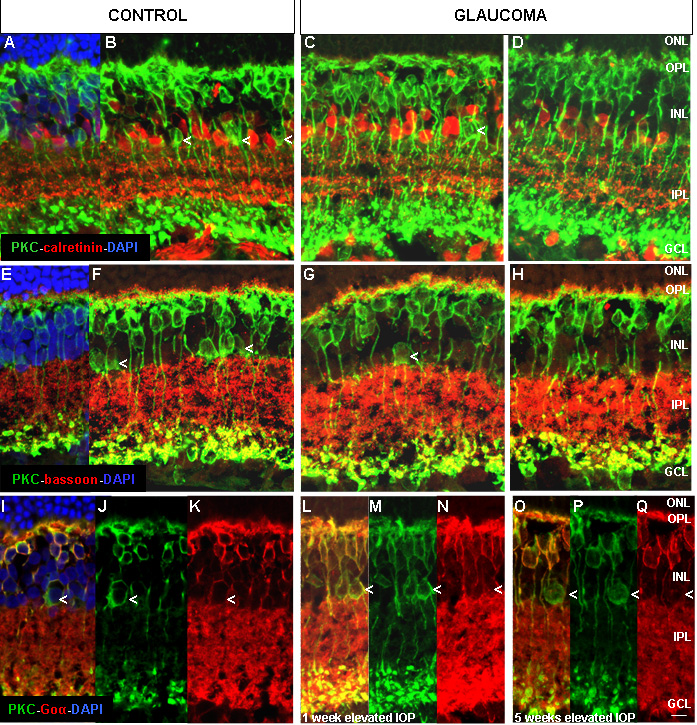 Figure 5. Confocal images of PKC-α, calretinin, bassoon, and Goα immunolocalization. Panels A-D show PKC-α (green), calretinin (red) and DAPI (blue). Panels E-H show PKC-α (green), bassoon (red), and DAPI (blue). Panels I-Q show PKC-α (green), Goα (red), and DAPI (blue). Arrows in B, C, F, G, and I-Q indicate a subpopulation of PKC-α-positive cells, located in the innermost INL, that may be affected by glaucoma. Abbreviations: