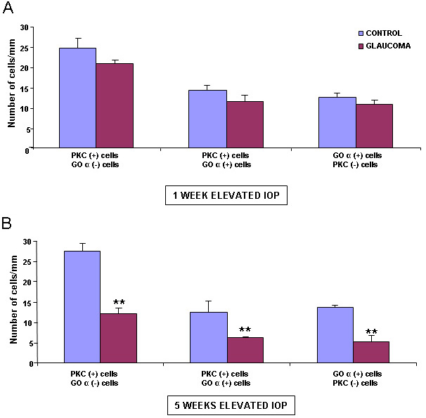 Figure 6. Number of cells per mm located in the INL labeled with PKC-α and Goα antibodies. (A) corresponds to one week of elevated IOP, and (B) to five weeks of elevated IOP (n=40 in all experimental groups). Results are expressed as mean±SEM. Statistically significant