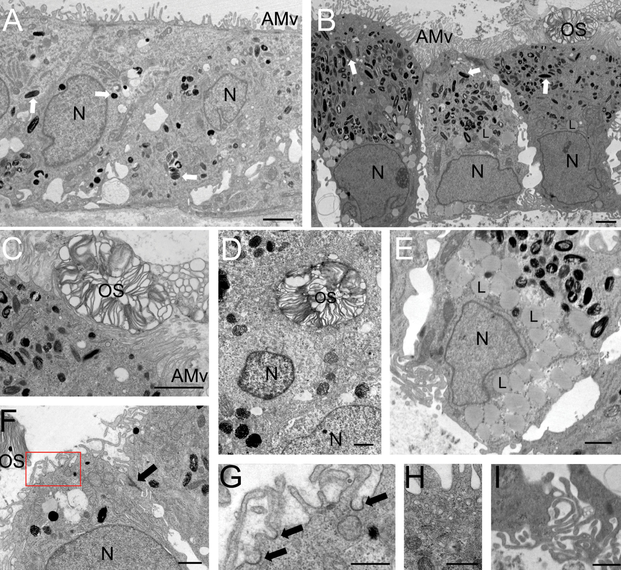 feet and infolding of the basal membrane (I). Scale bars equal 2