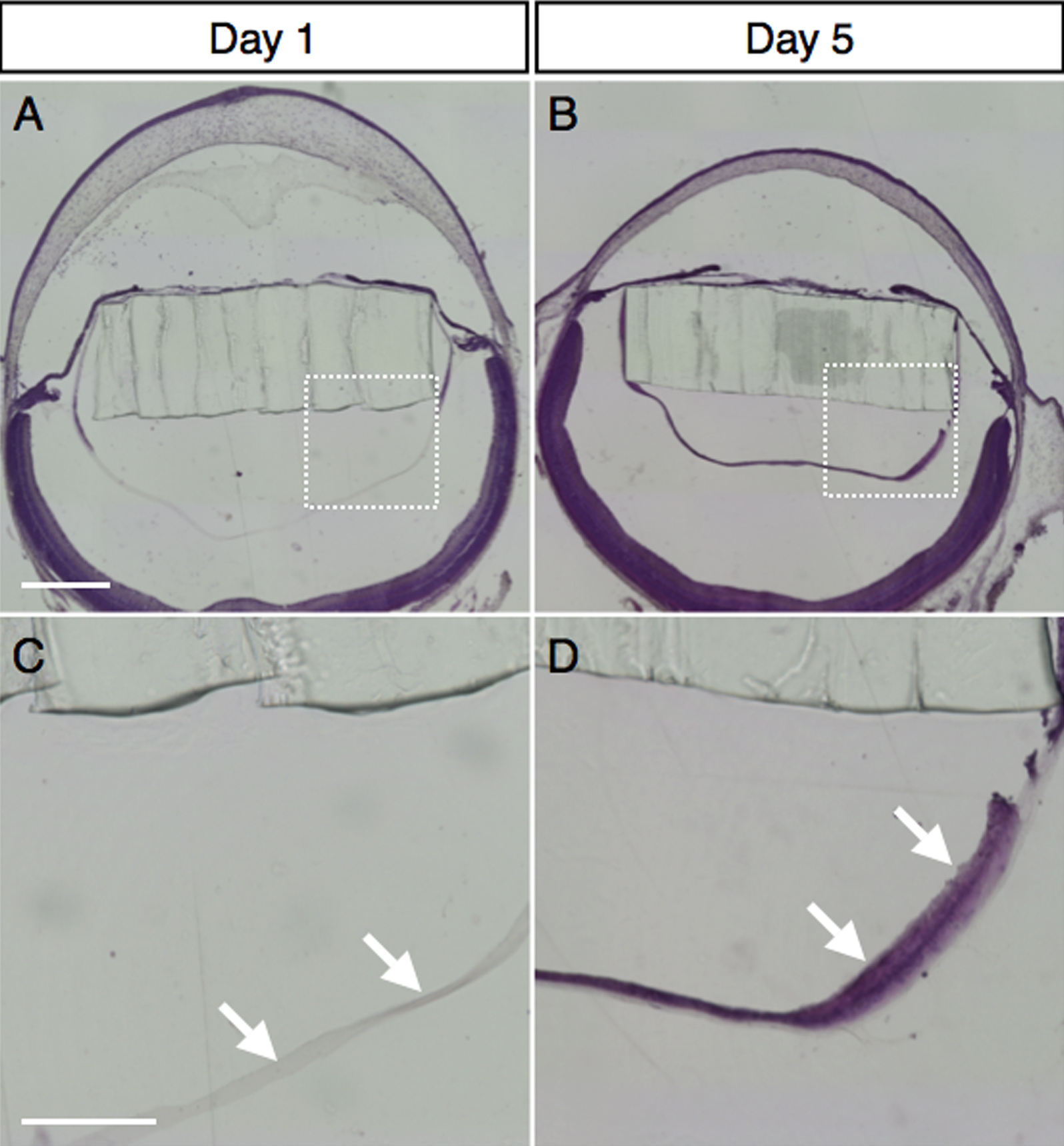 micrographs of murine IOL-implanted eyes, stained with hematoxylin and